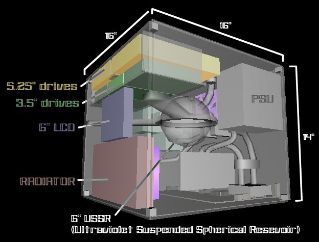 After throwing ideas back and forth with CaptainSlg we finnally came up with this. It is all Polycarbonate, minus screws and the center dome. You all wondered why I had the post "seaching for balls". Well this is why. Much thanks goes to Captainslg for his designing and rendering of this case. I hope you all like it as much as I do.